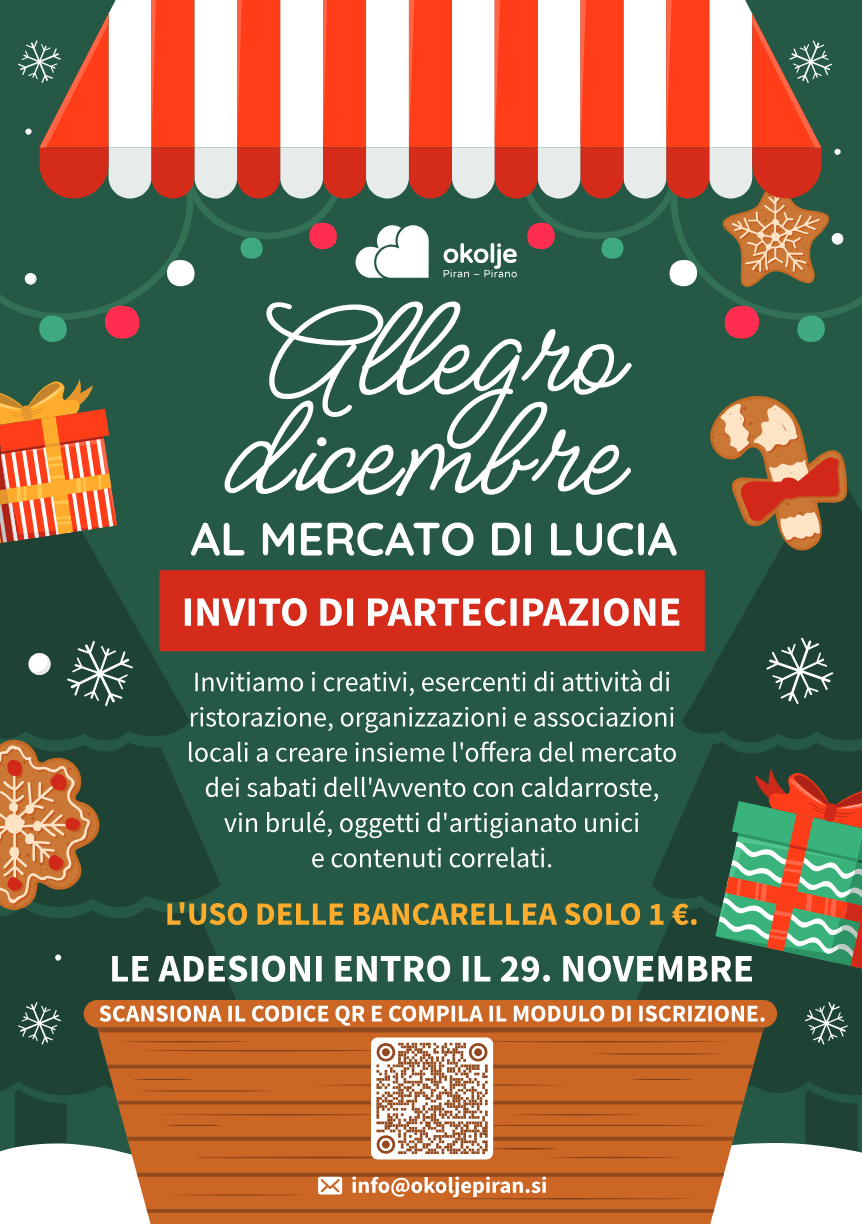 L’Azienda pubblica Okolje Pirano invita le associazioni, organizzazioni, ristoratori e i singoli che operano nell’area del Comune di Pirano a creare insieme l’atmosfera festosa di dicembre al mercato di Lucia.