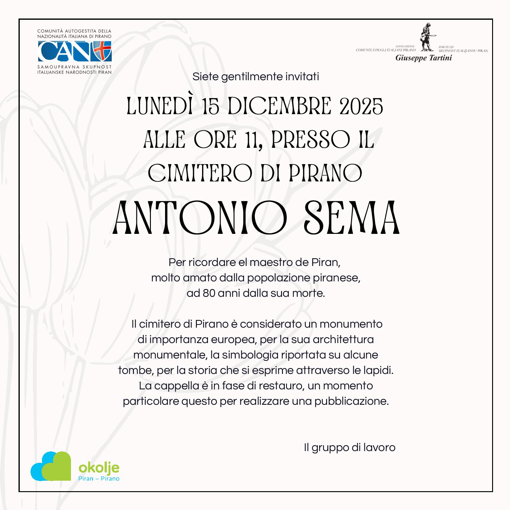 Lunedì, al cimitero di Pirano, ricorderemo l’80° anniversario della scomparsa di Antonio Sema – stimato insegnante piranese, pensatore progressista e figura che ha lasciato un profondo segno nella nostra comunità. La sua vita è stata dedicata alla conoscenza, al dialogo e alla giustizia sociale.