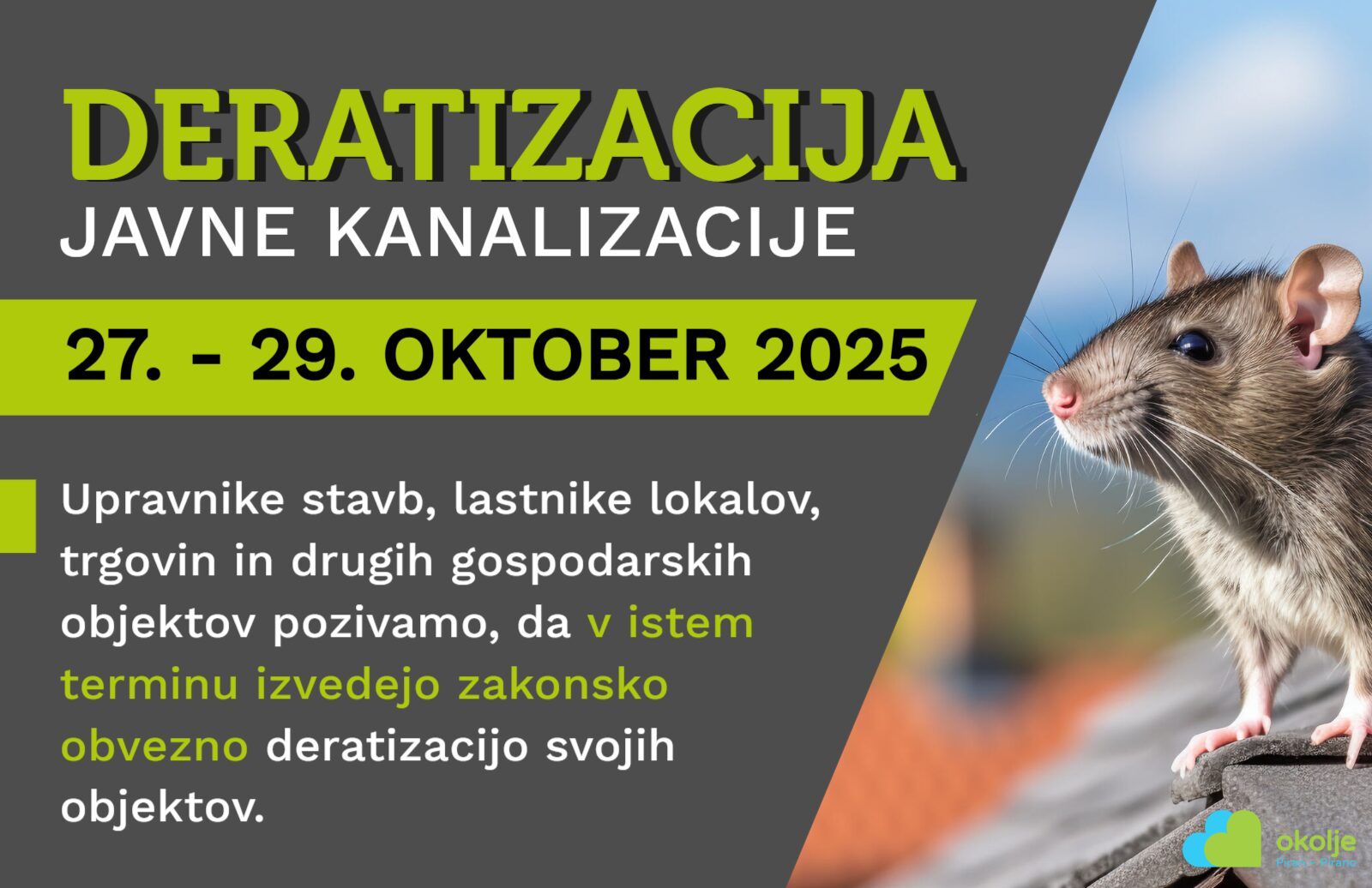 - Upravniki in gospodarski subjekti: Upravniki večstanovanjskih zgradb, lastniki gostinskih lokalov, trgovin in ostalih gospodarskih objektov, ki so zakonsko dolžni opravljati redno deratizacijo, pa so vabljeni, da tudi sami v tem terminu izpolnijo svoje obveznosti. Na podlagi izkušenj bo zatiranje škodljivcev uspešnejše, če bo deratizacija istočasno opravljena na celotnem območju .