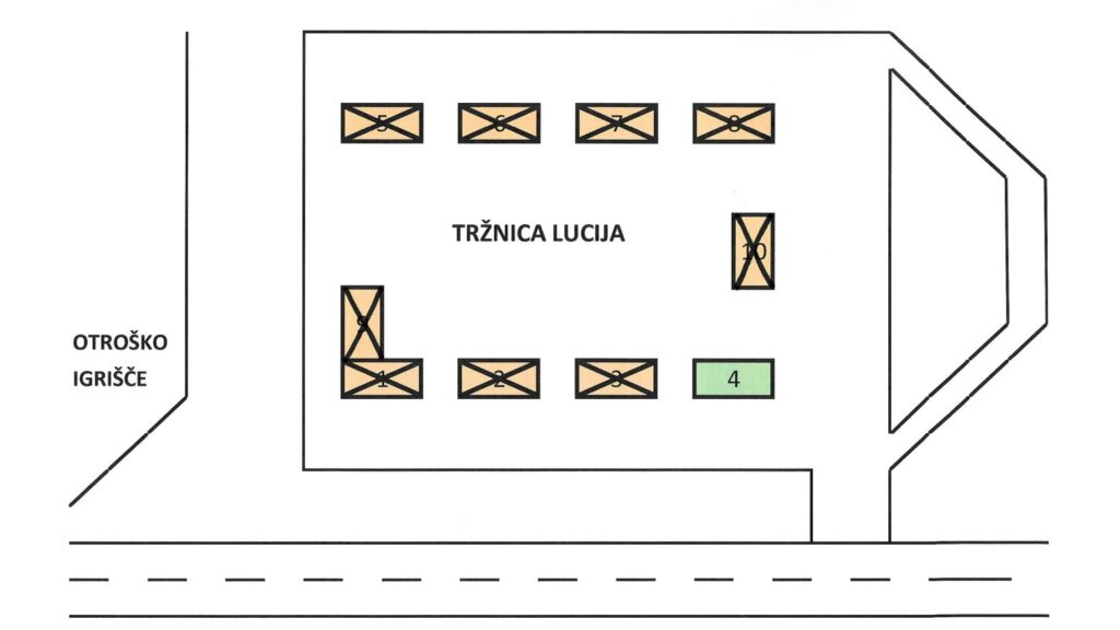 PREDMET RAZPISA: Javno podjetje Okolje Piran, d.o.o. objavlja namero o sklenitvi neposredne pogodbe za oddajo v najem prodajnega mesta za daljše časovno obdobje (stalni prodajalci) na Tržnici v Luciji. Predmet oddaje je prodajno mesto št. 4, označeno na priloženi skici. Letna najemnina znaša 100,36 EUR brez DDV, za leto 2025 pa se plača sorazmerni del najemnine. Pogodba bo sklenjena za določen čas do 31. 12. 2028.