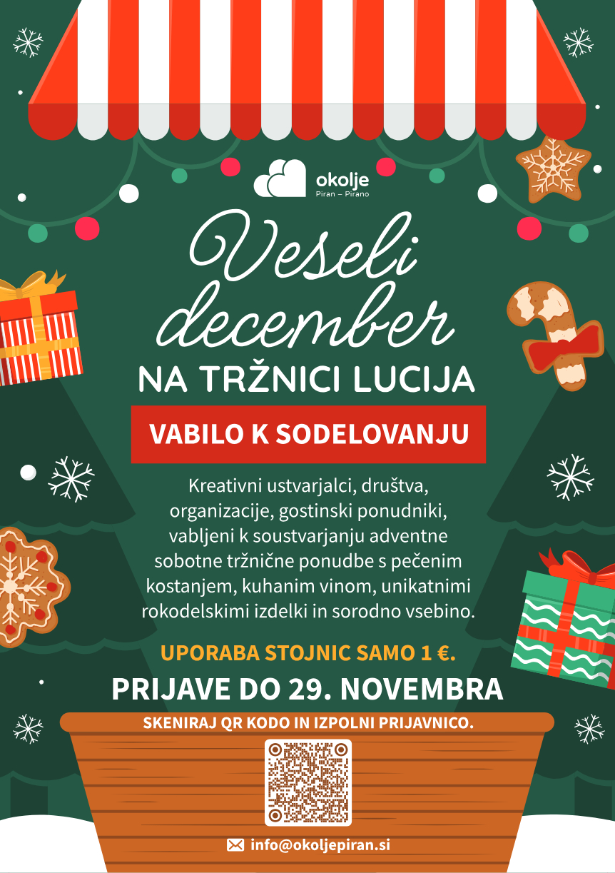 Javno podjetje Okolje Piran vabi društva, organizacije, gostince in posameznike, ki delujejo na območju občine Piran, k soustvarjanju decembrskega prazničnega vzdušja na tržnici Lucija.